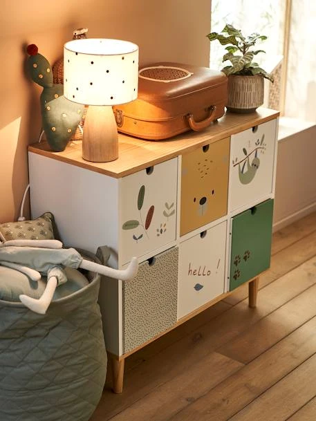 Un meuble coloré et animé qui raconte de belles histoires d’aventures dans la jungle ! Pratiques, ses 6 bacs vous permettent de trier les habits ou les jouets de vos enfants. Les pieds et le plateau en pin massif amènent une jolie touche contrastée pour une déco à la fois fun et tendance !