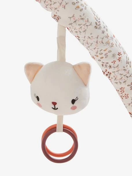 - Sur les arches : 3 jouets suspendus : un chat avec 2 anneaux en plastique colorés, une souris avec anneau en plastique transparent et billes colorées, 1 lapin « pouet pouet » avec un cœur